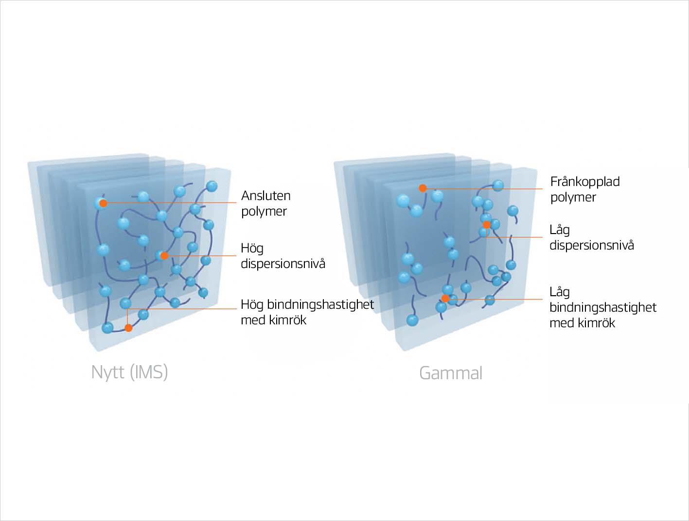 Innovativt blandningssystem (IBS) minimerar nedbrytning och oxidation av polymerkedjor och har en högre dispersionsgrad av kimrök. Effekterna av IBS bidrar till att stärka bindningskraften mellan kimrök och gummi för att säkerställa längre körsträcka och för att sänka värmeproduktionen av föreningar för förbättrad bränsleeffektivitet.